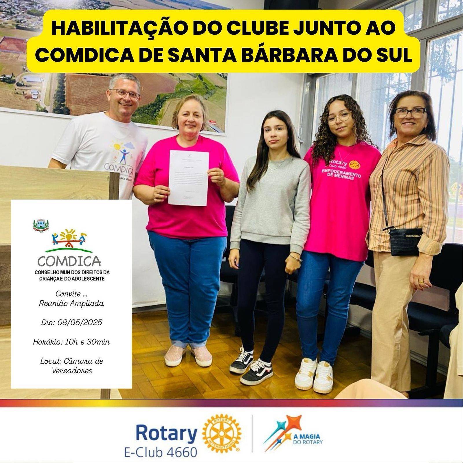 O COMDICA - Conselho Municipal dos Direitos da Criança e do Adolescente de Santa Bárbara do Sul, realizou reunião ampliada e o Rotary E-Club 4660 recebeu oficialmente a habilitação para participar dos editais do conselho de projetos voltados ao público infantojuvenil. Estiveram presentes na ocasião a coordenadora Dulce Caleffi, a tesoureira Ana Luiza Bavaresco, Evelin e Agnes participante do programa de Empoderamento de Meninas Agnes, alem do presidente Leonardo e mães de participantes do programa.