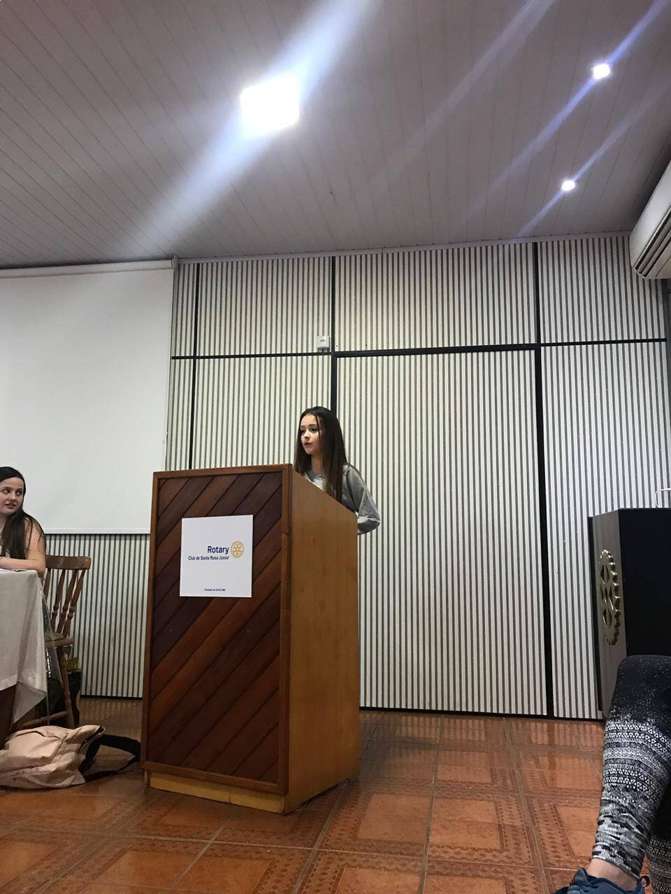 Na reunião do Dia do Convidado houve um momento em que cada um apresentou-se, falou um pouco sobre si e o que lhe motivou a participar do Interact. Na foto acima, temos a convidada Brenda Batista.