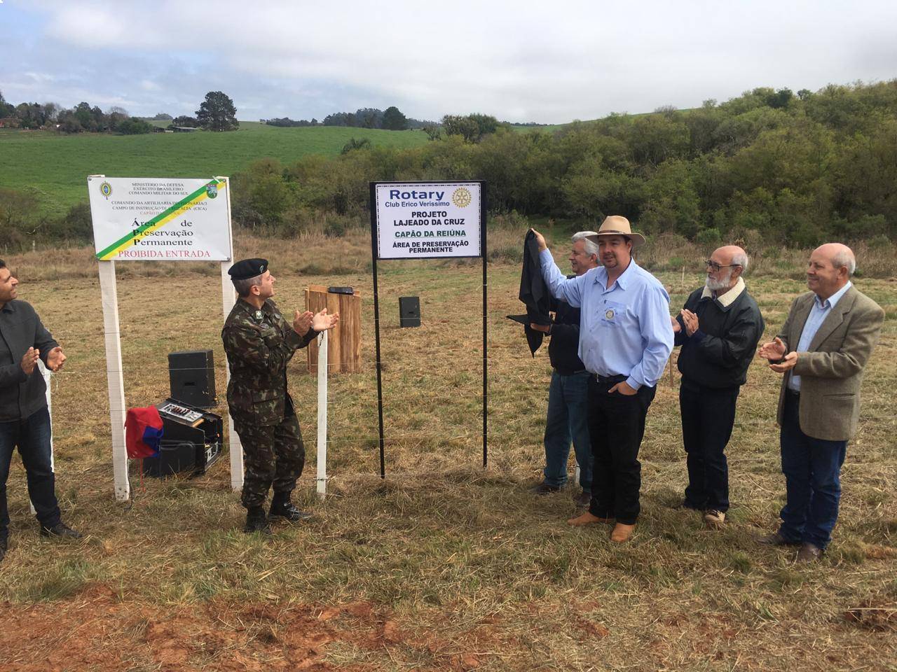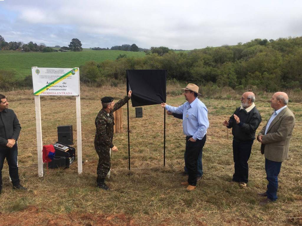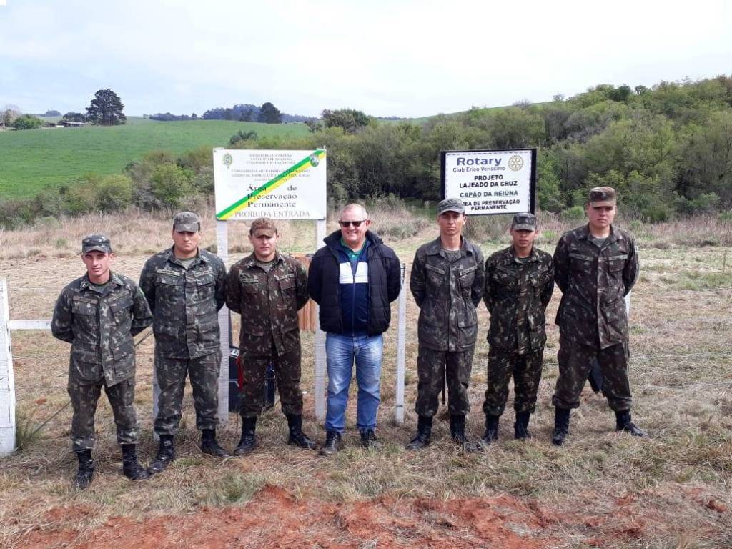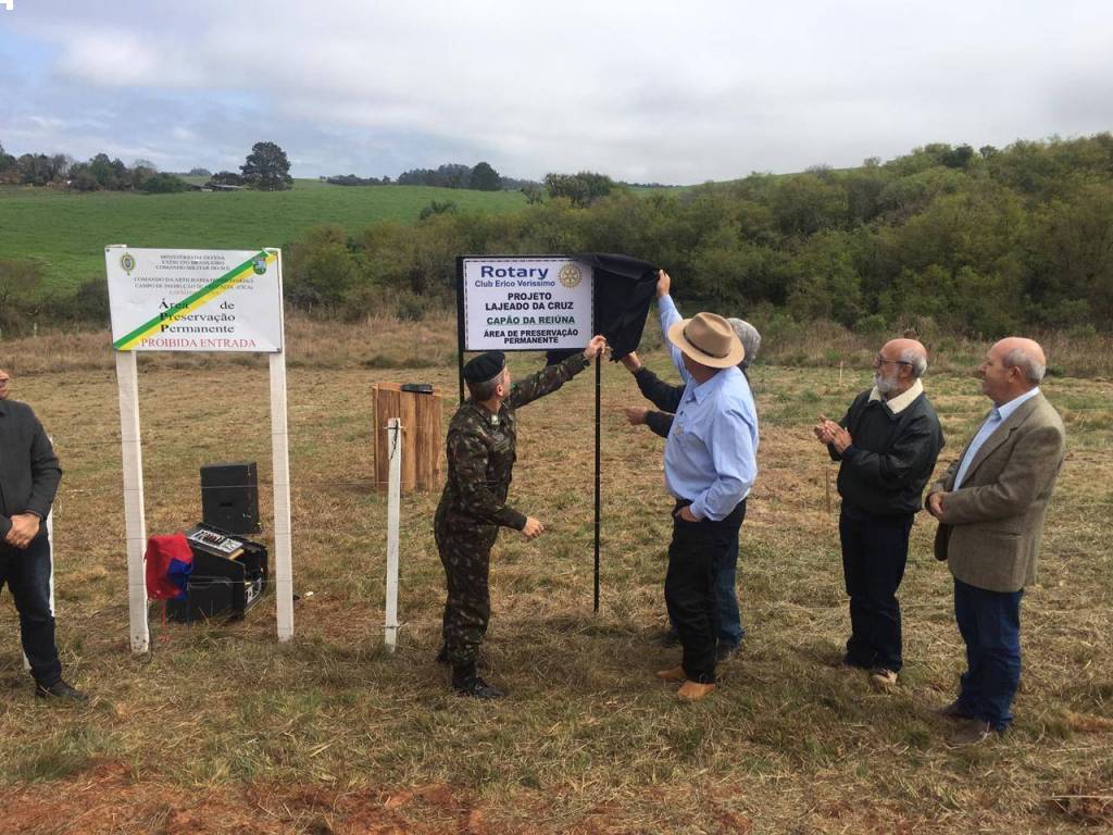 No dia 21 de setembro realizou-se a solenidade para realizar a inauguração do cercamento das nascentes do Capão da Reiúna, no Campo de Instrução de Cruz Alta (CICA) e concluir o plantio de 1.00 (mil mudas de árvores nativas). Essas nascentes fazem parte da Bacia Hidrográfica do Lajeado da Cruz e são as primeiras de inúmeras nascentes que brotam dentro do Campo de Instrução e deságuam diretamente no Lajeado da Cruz, lago que abastece toda a cidade de Cruz Alta. Esta obra reveste-se de fundamental importância pois visa evitar a erosão e o assoreamento do solo e dos lagos, garantindo com isso a preservação das nascentes e contribuindo sobremaneira com a qualidade da água que chega até o reservatório da CORSAN sem nenhum tipo de poluição ou contaminação. Ao todo foram utilizados: 85 palanques de madeira, 423 tramas de madeira, 3.500 m de fio de aço galvanizado, Custo do material: R$ 10.738,00. Além do projeto que ora inauguramos vale citar também o cercamento das nascentes do Capão da Roda d`Água, numa área de 8,9 hectares, onde existem 5 grandes nascentes, realizada em 2011, pelo Rotary Club Érico Veríssimo e plantio de mudas de árvores em parceria com o Comando da AD/3. Em 2017 a Administração do CICA efetuou o cercamento das nascentes do Capão dos Gravatás, numa área de 0,5 hectares onde brotam 5 nascentes. Ainda no corrente ano pretendemos cercar o Capão das Capivaras, cujo material já está depositado no CICA, envolvendo a mesma parceria. Estamos confeccionando um projeto para o ano de 2020 cercar a APP das Nascentes Érico Veríssimo, próximo à cota 464, deixando assim totalmente preservadas todas as nascentes que deságuam, abastem e ajudam formar o Lajeado da Cruz, garantindo a excelente qualidade da água para a população cruzaltense e de forma permanente para as gerações futuras. Além disso, estamos em tratativas para que possivelmente em 2020 possamos efetuar o plantio de 1.000 mudas nessas nascentes. Nos últimos 4 anos foram plantadas mais de 6.000 mudas de árvores nativas no interior do CICA, com grande índice de aproveitamento. Estamos trabalhando nesse projeto há 25 anos, e continuaremos, enquanto houverem pessoas que precisem beber água, que, aliás, é o nosso principal alimente e compõe cerca de 75% do nosso corpo. Vale dizer, o projeto não tem fim. Atualmente, os nossos recursos financeiros vêm através do Festival do Chopp, realizado anualmente, e que neste ano acontecerá no Clube Arranca, dia 09 de novembro próximo, com a presença das bandas Rogério Magrão e Arco íris.
